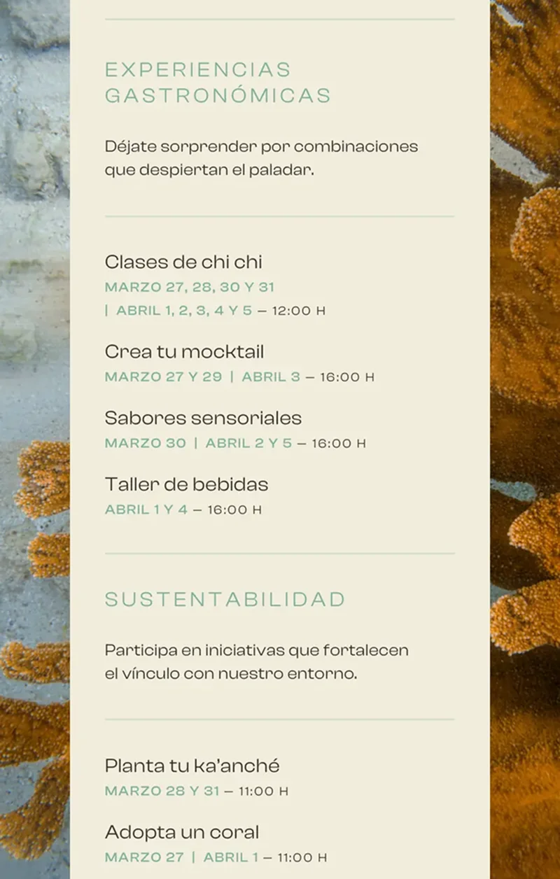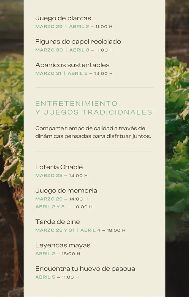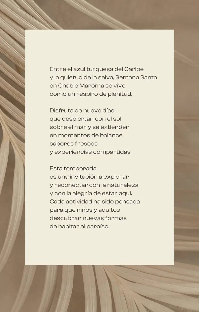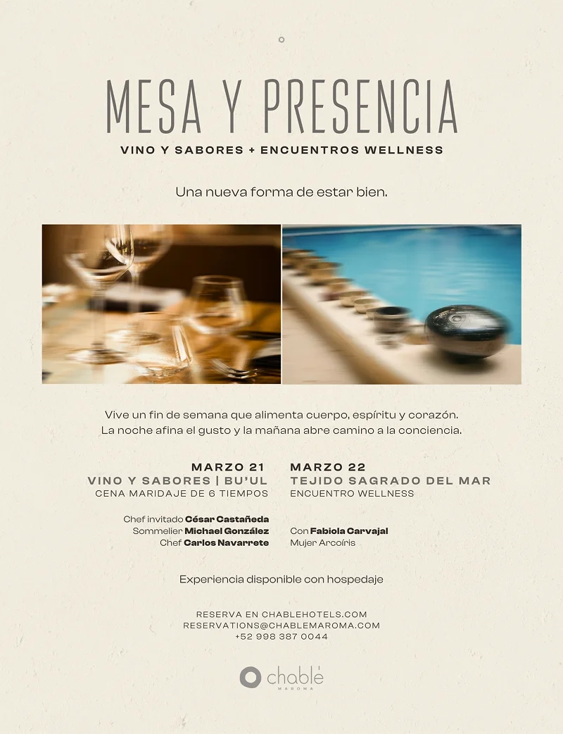 Los eventos especiales y los acontecimientos habituales aportan aún más profundidad a su experiencia en Chablé Hotels de dejar atrás lo cotidiano y encontrarse en el aquí y ahora. Manténgase en contacto a través de nuestra lista de correo electrónico y canales sociales para ser el primero en enterarse.